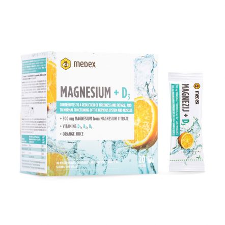 Teški fizički napori tijekom bavljenja sportom ubrzavaju gubitak magnezija, što je prvenstveno uzrokovano pojačanim znojenjem. Osobito pri visokoj temperaturi i vlažnosti, gubitak tekućine može biti velik (do 2 l na sat). Nedovoljna opskrba magnezijem može smanjiti funkciju mišića, povećavajući sklonost mišićnih vlakana pucanju i istezanju. Magnezij doprinosi funkciji mišića, ravnoteži elektrolita i oslobađanju metaboličke energije. Uz pojačanu sportsku aktivnost ne smijemo zaboraviti nadoknaditi izgubljenu tekućinu. Napitkom Magnezij + D3 osigurat ćemo hidrataciju i dovoljnu količinu magnezija. Uz pojačanu sportsku aktivnost možete unijeti 2 vrećice ili 600 mg magnezija.